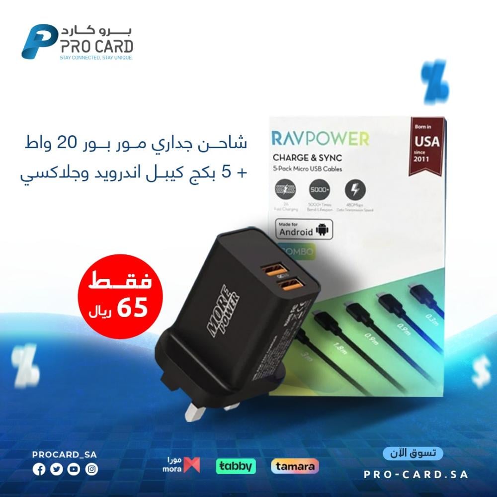 نقدم لكم عرضًا لا يُقاوم يشمل شاحن جداري عالي الجودة مور باور بقوة 20 واط مع منفذين بضمان سنتين و5 كيابل راف باور متوافقة مع أجهزة أندرويد وسامسونج جالكسي ، كل ذلك بسعر رائع 65 ريال فقط! العرض ساري حتى نفاذ الكمية.