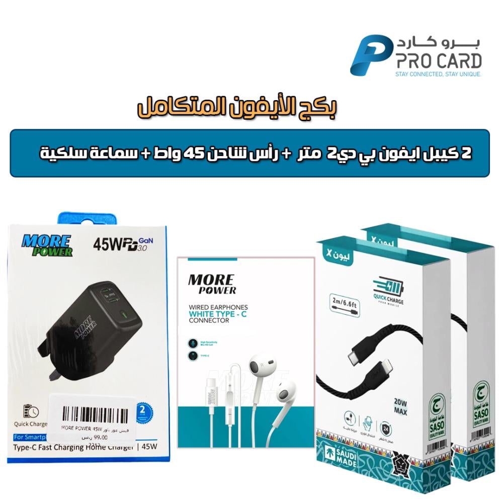 تجربة شحن لا مثيل لها وجودة صوتية فائقة مع بكج الايفون المتكامل من برو كارد. مصمم خصيصًا لتلبية احتياجاتك اليومية بكفاءة وأناقة.