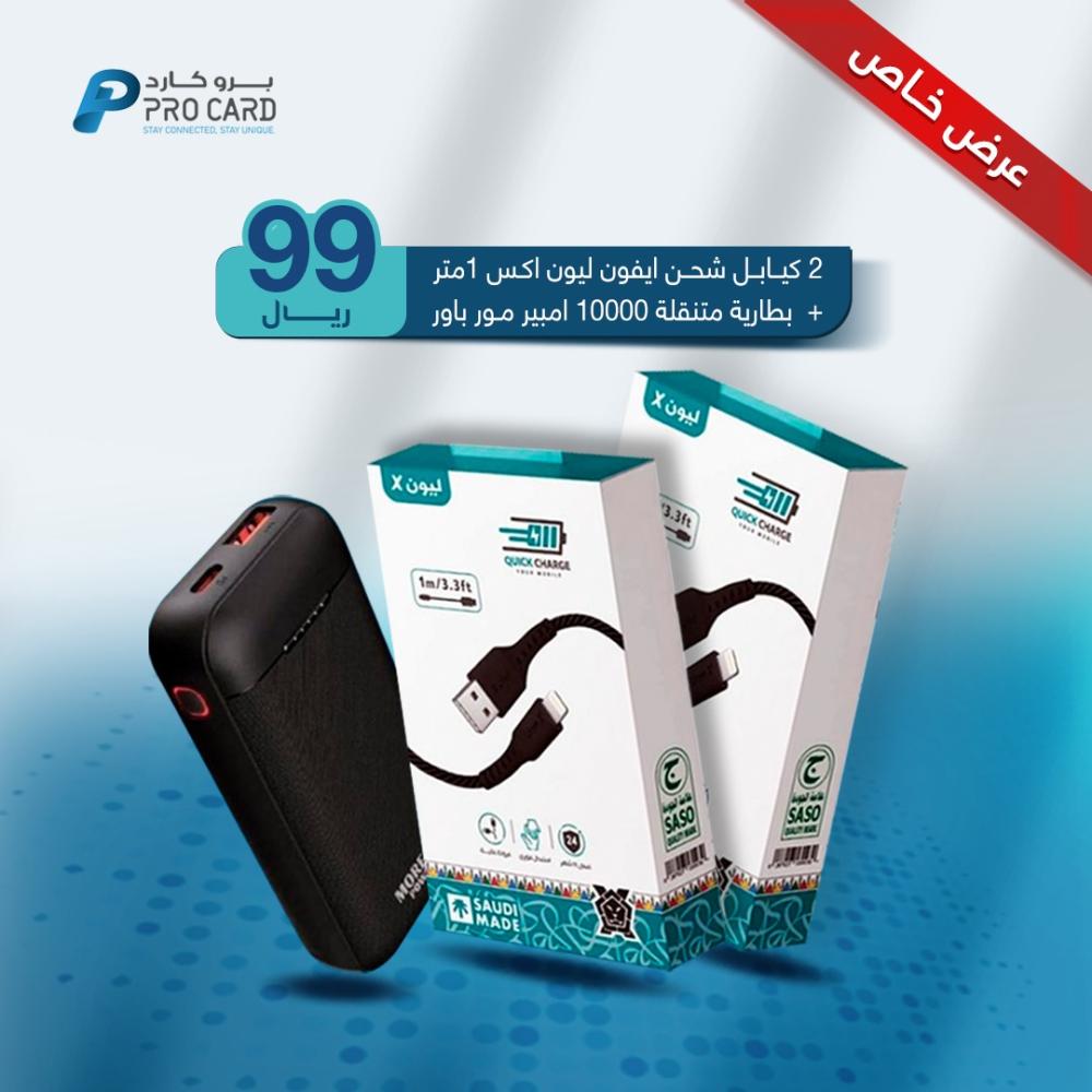 عروض وتخفيضات متجر برو كارد. نقدم لكم في هذا العرض حزمة رائعة تجمع بين الأداء القوي والتصميم الأنيق لتلبية جميع احتياجاتك التقنية. احصل على بطارية متنقلة من نوع مور باور بجودة عالية بسعة 10000 مللي أمبير تدوم لوقت طويل + 2 كيبل شحن آيفون ليون X بطول 1 متر .